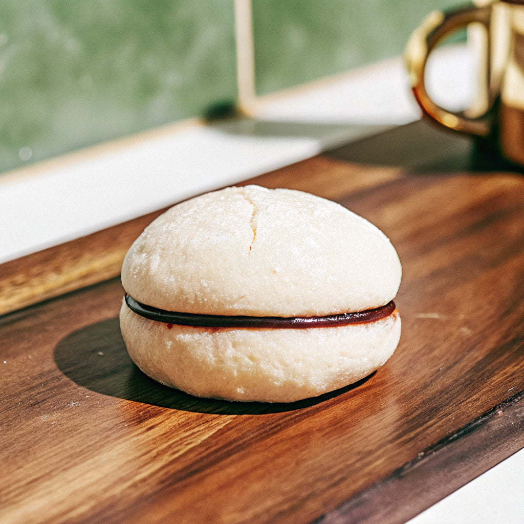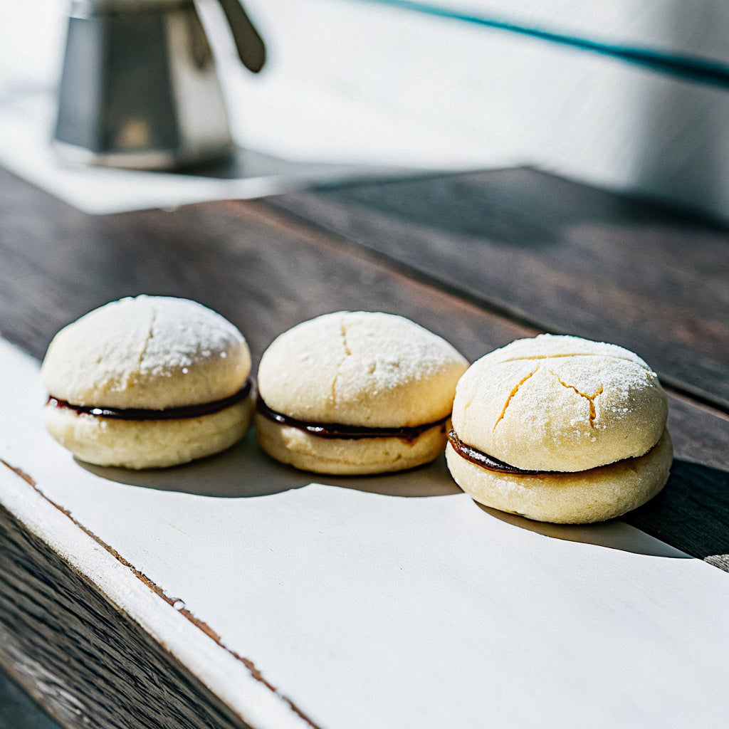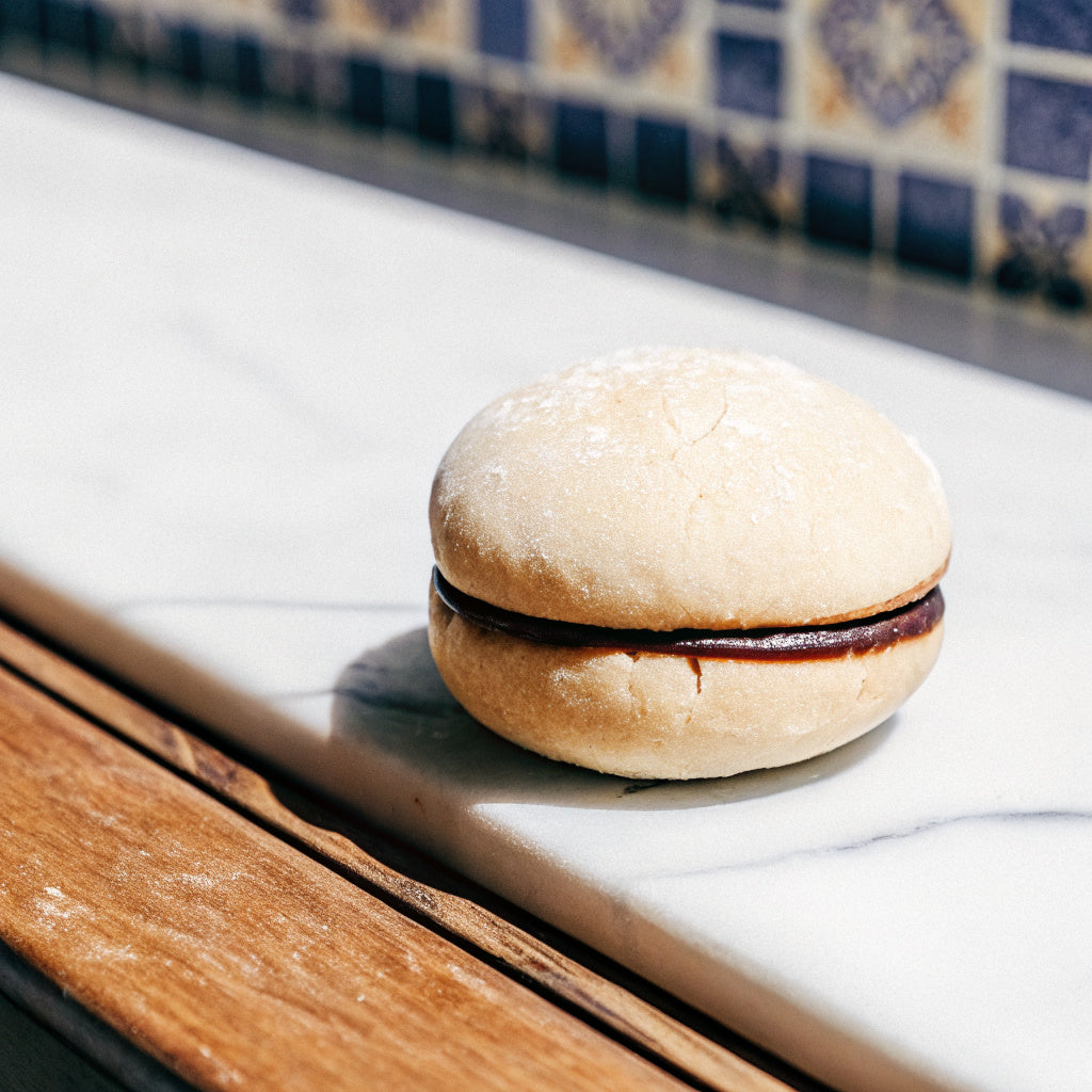 Two petite almond shortbread domes joined with dark chocolate. Ground almonds, butter, sugar, flour, and a pinch of sea salt baked to a crisp edge and short, sandy crumb. Filled with 66–70% dark chocolate for balance and a clean almond finish. Made in small batches. Serve with espresso or give as a refined gift.