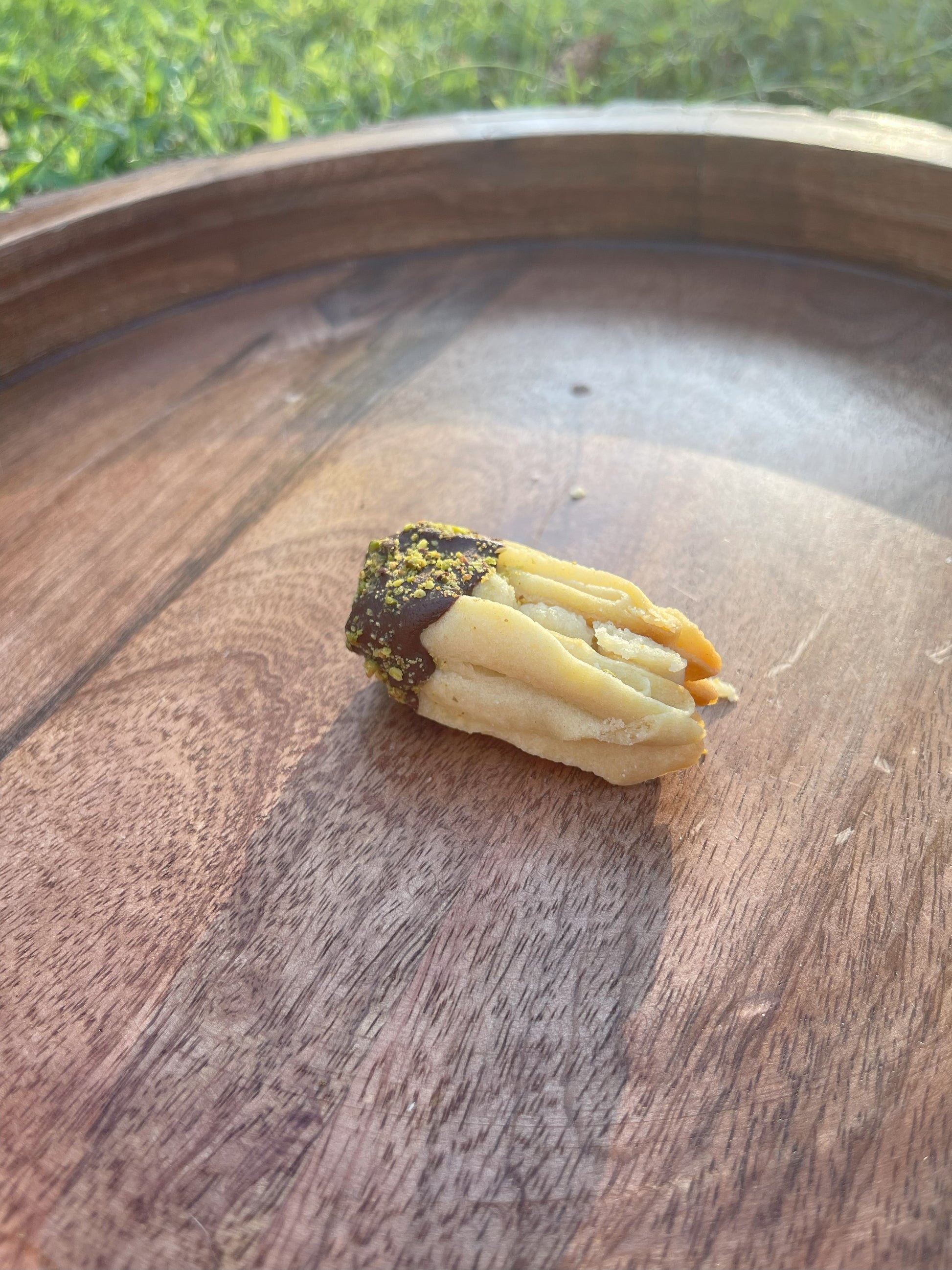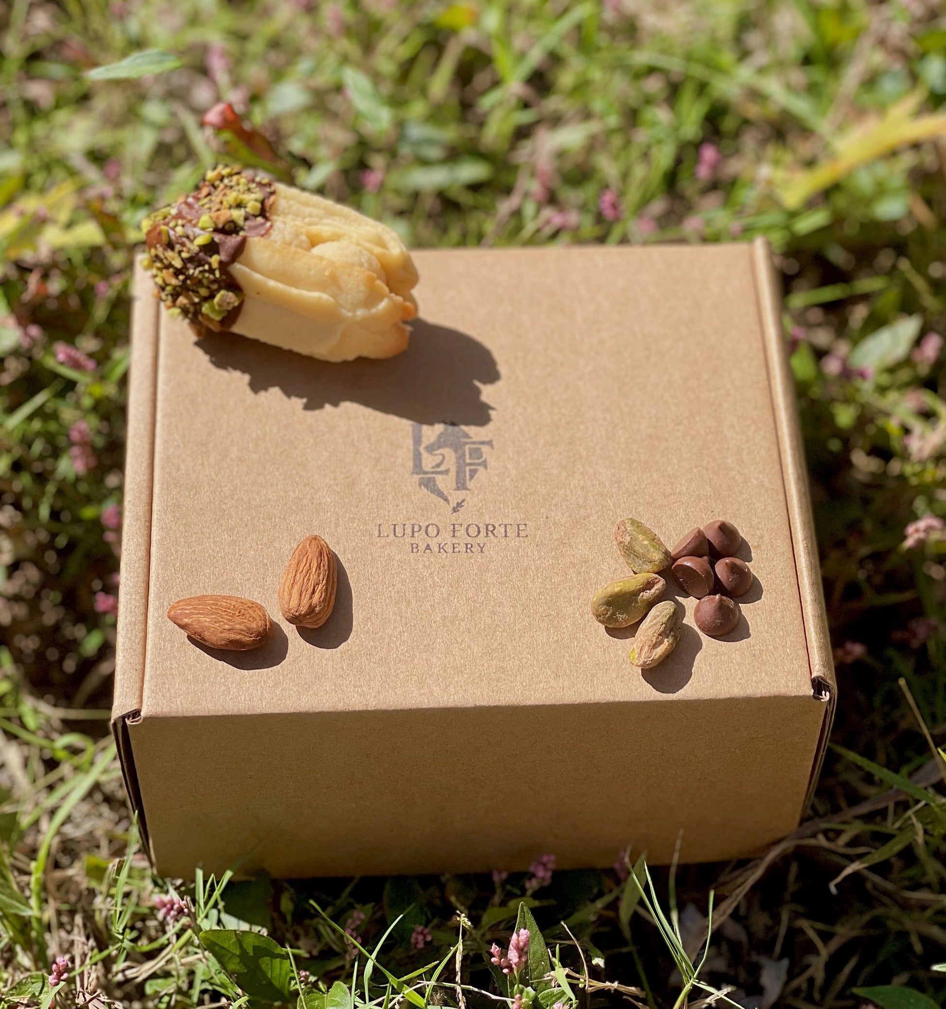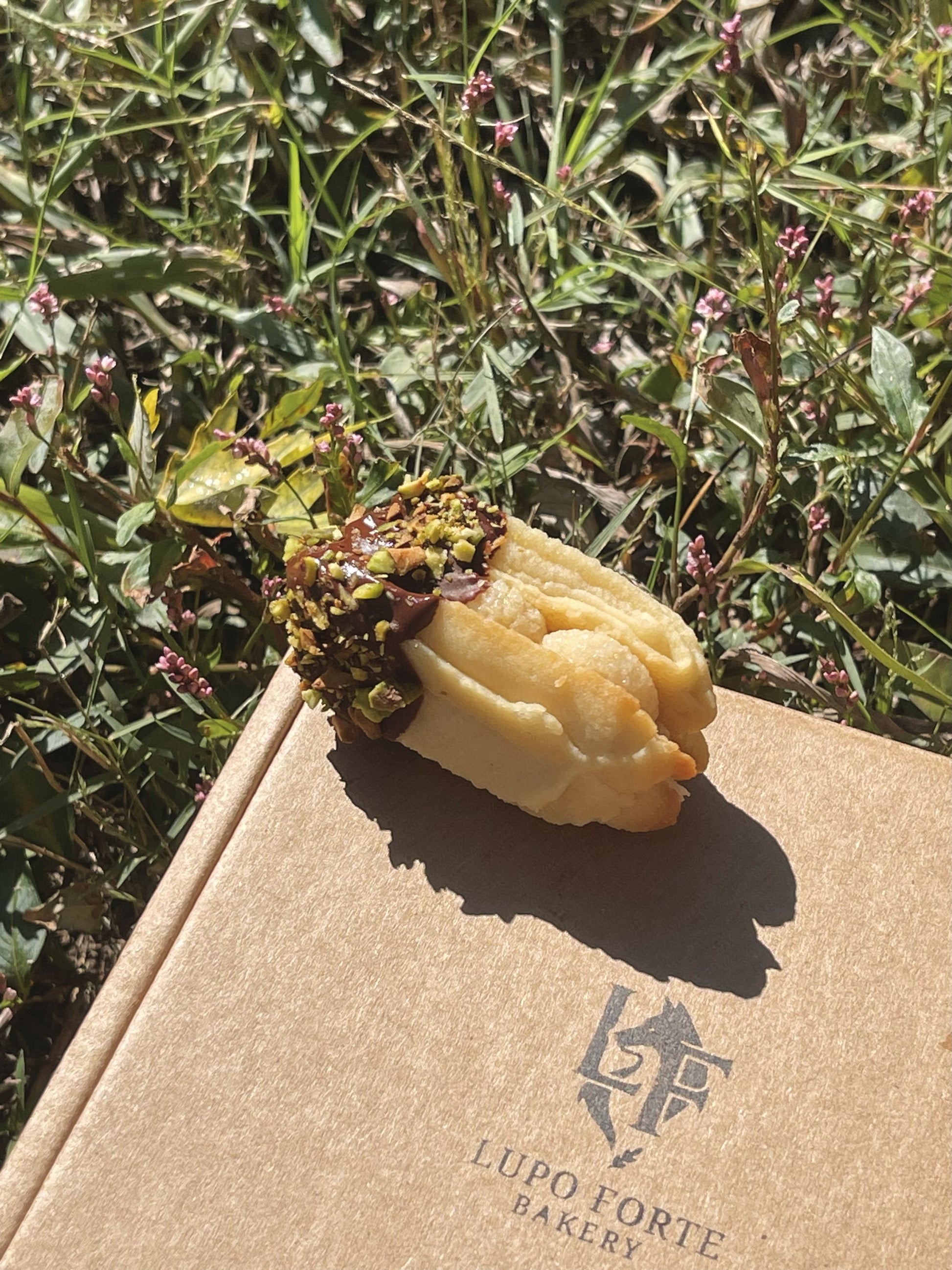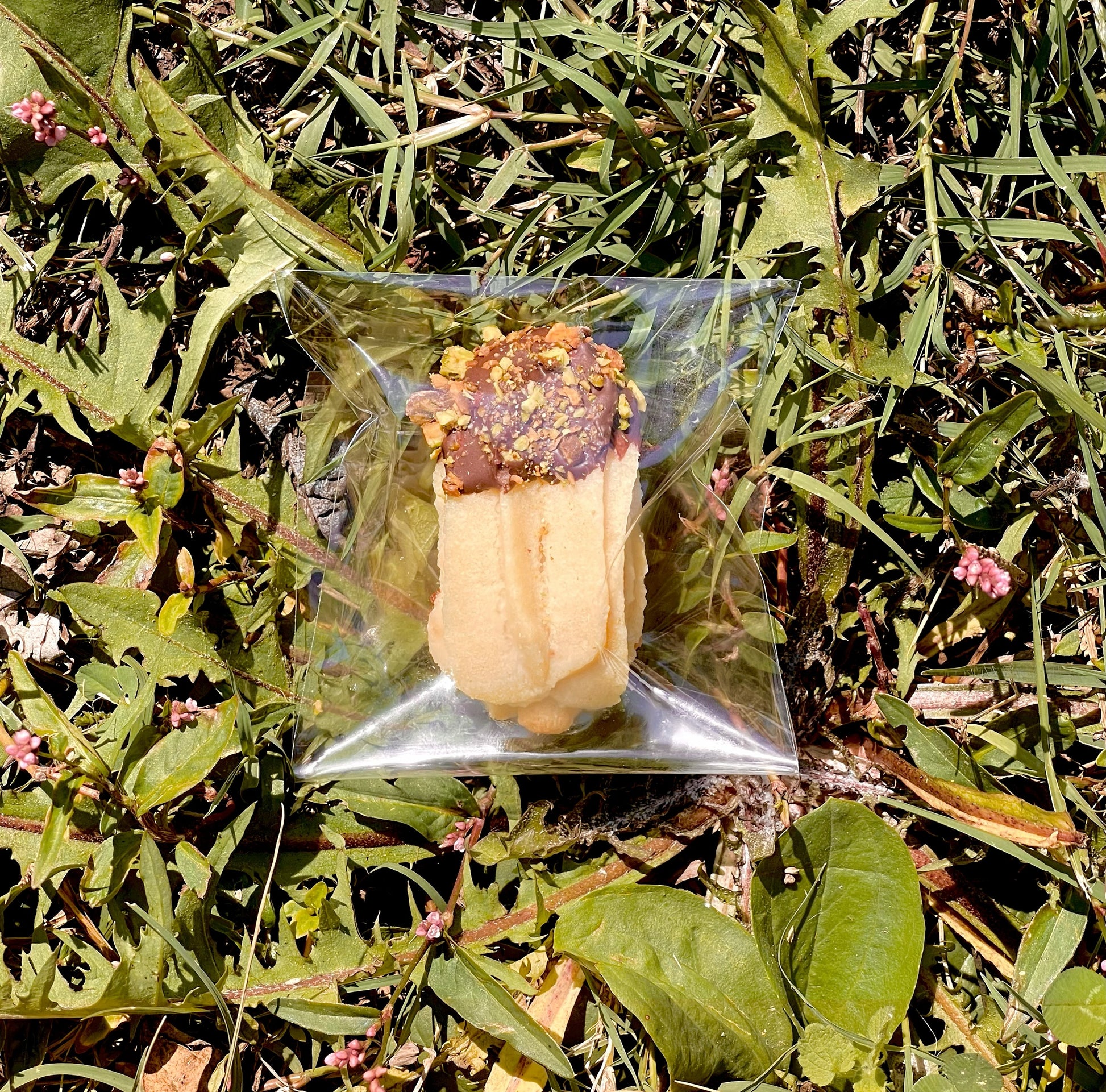 Golden ridges of almond butter shortbread, dipped in rich dark chocolate and filled with a smooth pistachio cream. Each cookie is finished with a dusting of crushed pistachios for contrast and crunch. The texture is crisp at first bite, giving way to a tender, buttery center balanced by the depth of chocolate and the delicate sweetness of almonds. Made in small batches with fine ingredients, these biscotti are crafted to impress at the table or as a refined gift. Pair with espresso or a glass of dessert wine for a classic Italian finish.